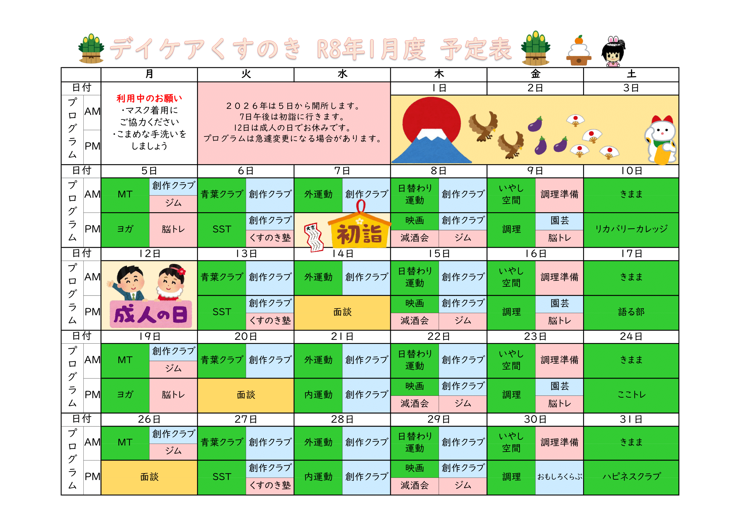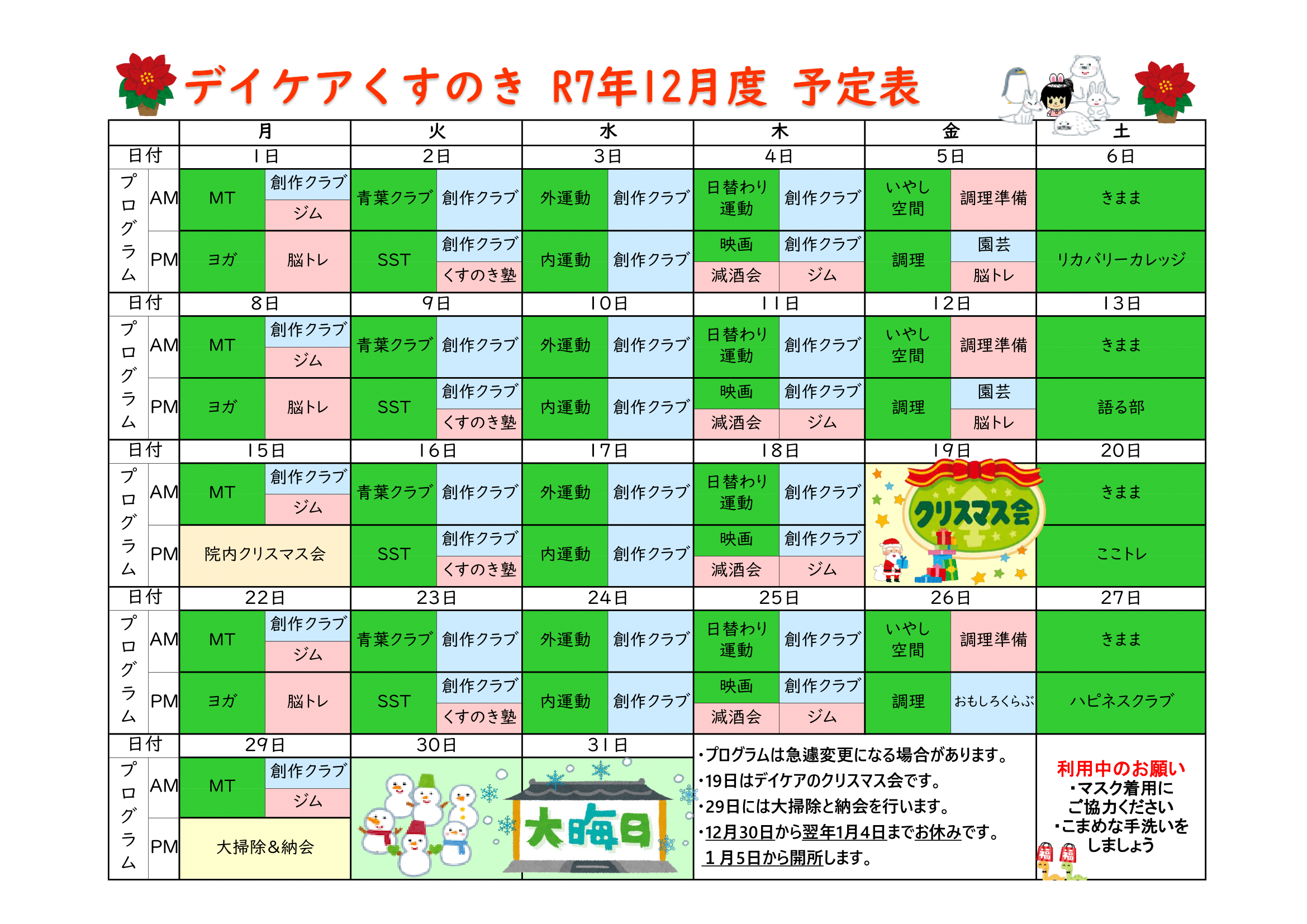 | 外出プログラム | 農耕、散歩、施設見学など |